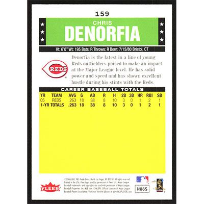 This is a 2006 Fleer Tradition Chris Denorfia baseball card. The card is #159 and pictures show condition. Team(s): Cincinnati Reds Rookie Card (RC)