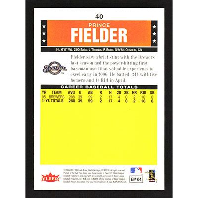 This is a 2006 Fleer Tradition Prince Fielder baseball card. The card is #40 and pictures show condition.
