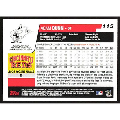 This is a 2006 Topps Adam Dunn baseball card. The card is #115 and pictures show condition.