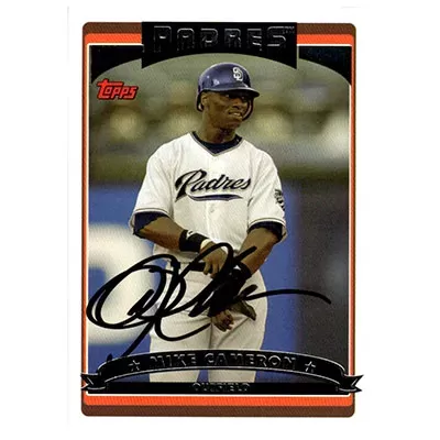 This is a 2006 Topps Mike Cameron autographed baseball card. This card has been signed, in black, by Mike Cameron, and is guaranteed authentic by Ballcardz.com. The card is #128 and is in NM-MT condition.