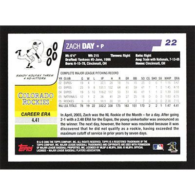 This is a 2006 Topps Zach Day baseball card. The card is #22 and pictures show condition.