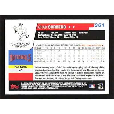 This is a 2006 Topps Chad Cordero baseball card. The card is #361 and pictures show condition.
