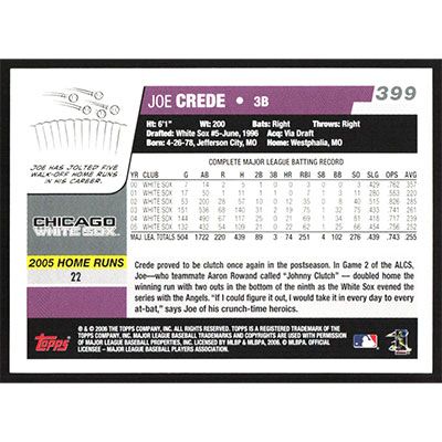 This is a 2006 Topps Joe Crede baseball card. The card is #399 and pictures show condition.