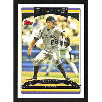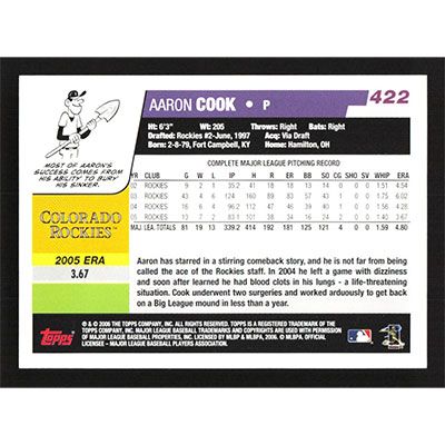 This is a 2006 Topps Aaron Cook baseball card. The card is #422 and pictures show condition.