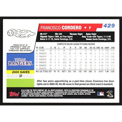 This is a 2006 Topps Francisco Cordero baseball card. The card is #429 and pictures show condition.