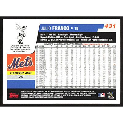 This is a 2006 Topps Julio Franco baseball card. The card is #431 and pictures show condition.