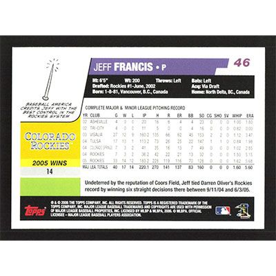 This is a 2006 Topps Jeff Francis baseball card. The card is #46 and pictures show condition.