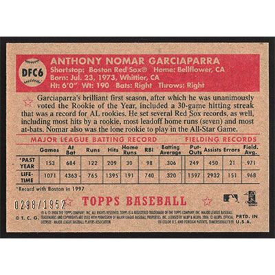 This is a 2006 Topps '52 Debut Flashbacks Chrome Nomar Garciaparra baseball card. The card is #DFC6 and pictures show condition. This card is limited; #'d 0298/1952.