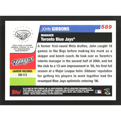 This is a 2006 Topps John Gibbons baseball card. The card is #589 and pictures show condition.