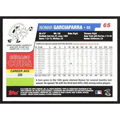 This is a 2006 Topps Nomar Garciaparra baseball card. The card is #65 and pictures show condition.