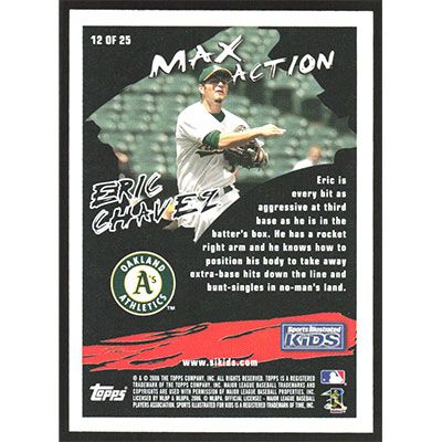 This is a 2006 Topps Opening Day Sports Illustrated For Kids Eric Chavez Max Action baseball card. The card is #12 and pictures show condition. Team(s): Oakland Athletics