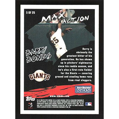 This is a 2006 Topps Opening Day Sports Illustrated For Kids Barry Bonds baseball card. The card is #5 and pictures show condition. Team(s): San Francisco Giants