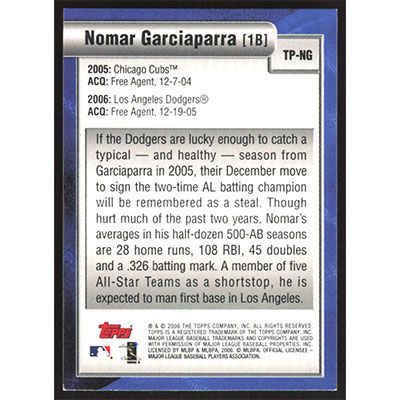 This is a 2006 Topps Trading Places Nomar Garciaparra baseball card. The card is #TP-NG and pictures show condition. Team(s): Chicago Cubs/Los Angeles Dodgers