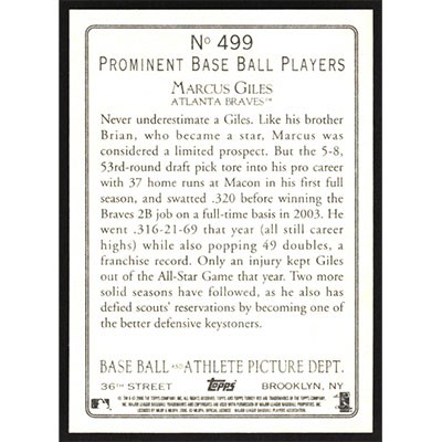 This is a 2006 Topps Turkey Red Marcus Giles autographed baseball card. This card has been signed, in blue, by Marcus Giles, and is guaranteed authentic by Ballcardz.com. The card is #499 and pictures show condition.