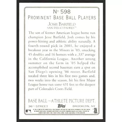 This is a 2006 Topps Turkey Red Josh Barfield baseball card. The card is #598 and pictures show condition. Team(s): San Diego Padres Rookie Card (RC)