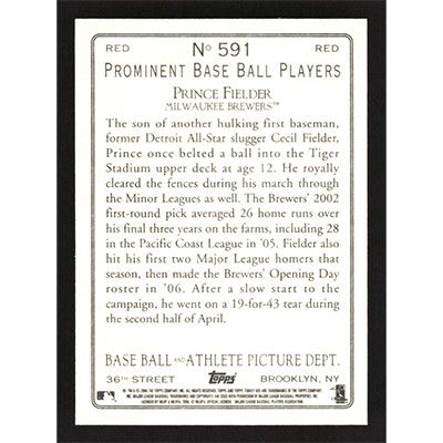 This is a 2006 Topps Turkey Red Red Prince Fielder baseball card. The card is #591 and pictures show condition. Team(s): Milwaukee Brewers Rookie Card (RC)