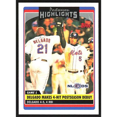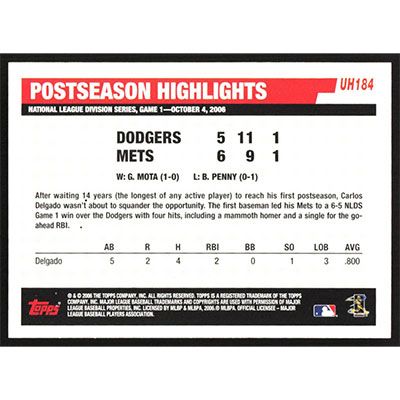 This is a 2006 Topps Update Carlos Delgado Postseason Highlights baseball card. The card is #UH184 and pictures show condition.