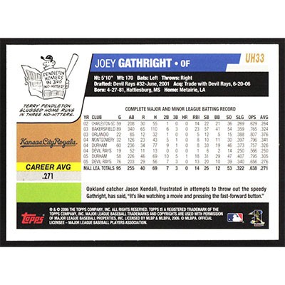 This is a 2006 Topps Update Joey Gathright baseball card. The card is #UH33 and pictures show condition.