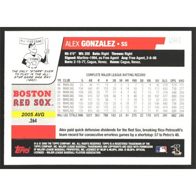 This is a 2006 Topps Update Alex Gonzalez baseball card. The card is #UH5 and pictures show condition.