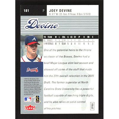 This is a 2006 Ultra Joey Devine baseball card. The card is #181 and pictures show condition.