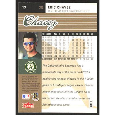 This is a 2006 Ultra Gold Medallion Eric Chavez baseball card. The card is #13 and pictures show condition.