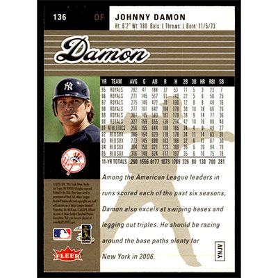 This is a 2006 Ultra Gold Medallion Johnny Damon baseball card. The card is #136 and pictures show condition.