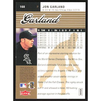 This is a 2006 Ultra Gold Medallion Jon Garland baseball card. The card is #168 and pictures show condition.