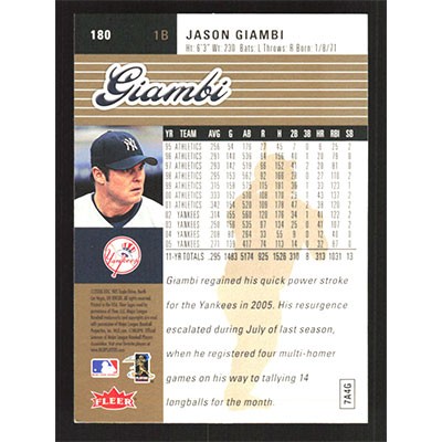 This is a 2006 Ultra Gold Medallion Jason Giambi baseball card. The card is #180 and pictures show condition.