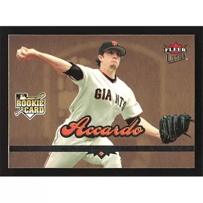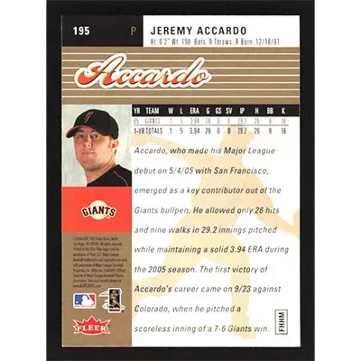 This is a 2006 Ultra Gold Medallion Jeremy Accardo baseball card. The card is #195 and pictures show condition. Team(s): San Francisco Giants Rookie Card (RC)