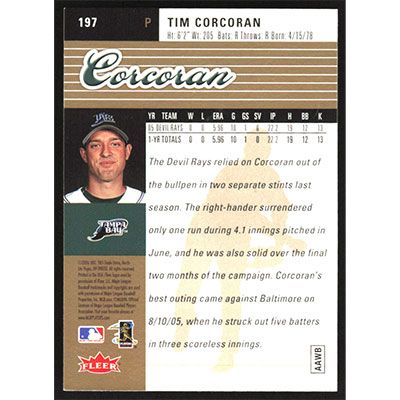 This is a 2006 Ultra Gold Medallion Tim Corcoran baseball card. The card is #197 and pictures show condition. Team(s): Tampa Bay Devil Rays Rookie Card (RC)
