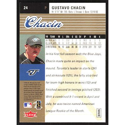 This is a 2006 Ultra Gold Medallion Gustavo Chacin baseball card. The card is #24 and pictures show condition.