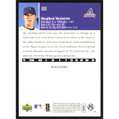 This is a 2006 Upper Deck Stephen Drew baseball card. The card is #1001 and pictures show condition.