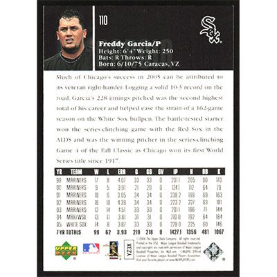 This is a 2006 Upper Deck Freddy Garcia autographed baseball card. This card has been signed, in blue, by Freddy Garcia, and is guaranteed authentic by Ballcardz.com. The card is #110 and pictures show condition.