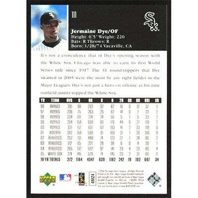 This is a 2006 Upper Deck Jermaine Dye baseball card. The card is #111 and pictures show condition.