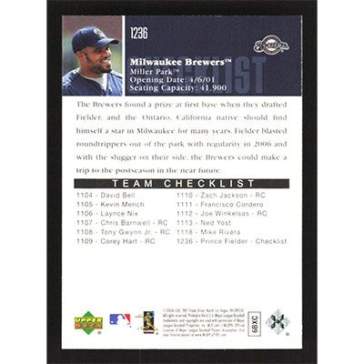 This is a 2006 Upper Deck Prince Fielder SP - Team Checklist baseball card. The card is #1236 and pictures show condition.