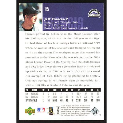 This is a 2006 Upper Deck Jeff Francis baseball card. The card is #165 and pictures show condition.