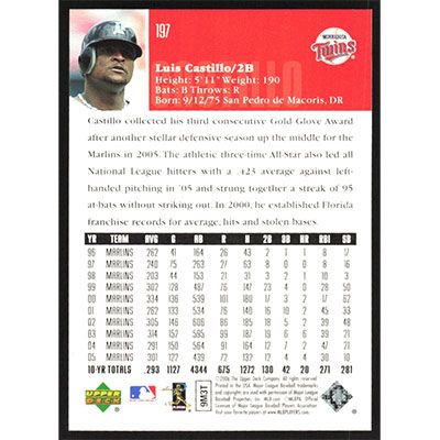 This is a 2006 Upper Deck Luis Castillo baseball card. The card is #197 and pictures show condition.