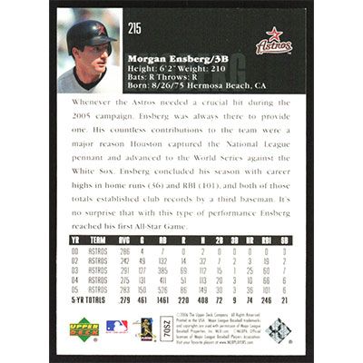 This is a 2006 Upper Deck Morgan Ensberg baseball card. The card is #215 and pictures show condition.