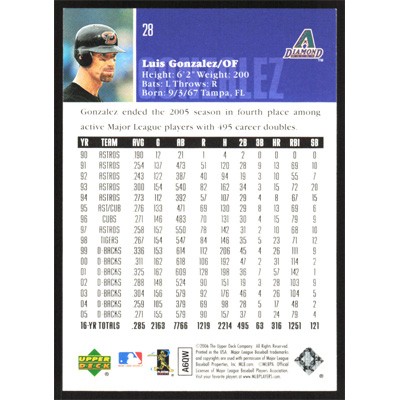This is a 2006 Upper Deck Luis Gonzalez baseball card. The card is #28 and pictures show condition.