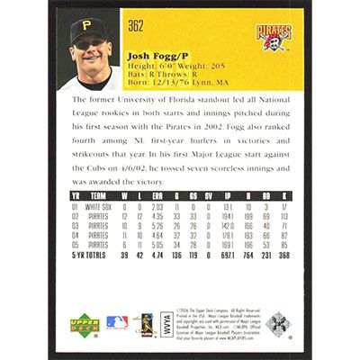 This is a 2006 Upper Deck Josh Fogg baseball card. The card is #362 and pictures show condition.