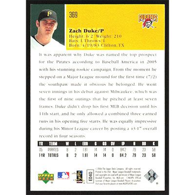This is a 2006 Upper Deck Zach Duke baseball card. The card is #369 and pictures show condition.
