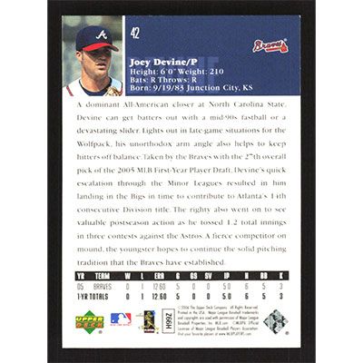 This is a 2006 Upper Deck Joey Devine baseball card. The card is #42 and pictures show condition.