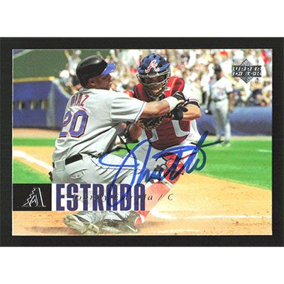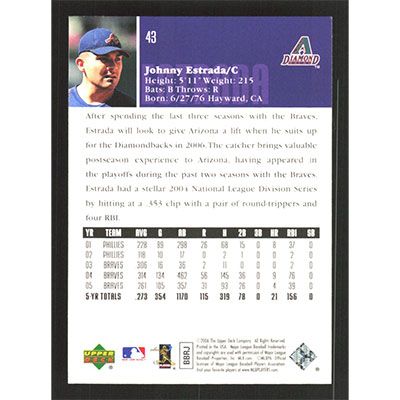 This is a 2006 Upper Deck Johnny Estrada autographed baseball card. This card has been signed, in blue, by Johnny Estrada, and is guaranteed authentic by Ballcardz.com. The card is #43 and pictures show condition.