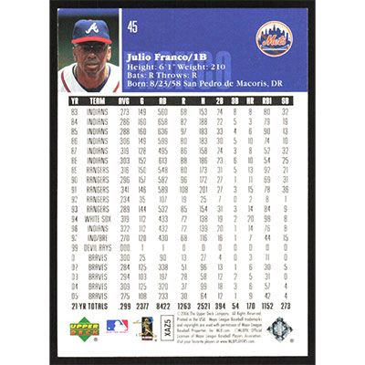 This is a 2006 Upper Deck Julio Franco autographed baseball card. This card has been signed, in blue, by Julio Franco, and is guaranteed authentic by Ballcardz.com. The card is #45 and pictures show condition.
