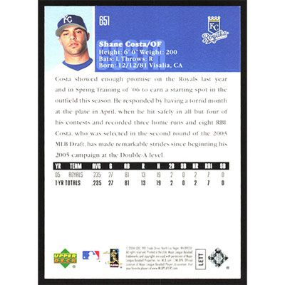 This is a 2006 Upper Deck Shane Costa baseball card. The card is #651 and pictures show condition.