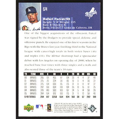 This is a 2006 Upper Deck Rafael Furcal baseball card. The card is #674 and pictures show condition.