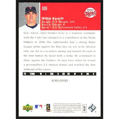 This is a 2006 Upper Deck Willie Eyre baseball card. The card is #699 and pictures show condition.