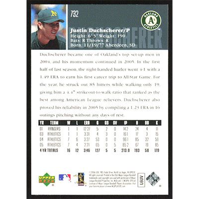 This is a 2006 Upper Deck Justin Duchscherer baseball card. The card is #732 and pictures show condition.