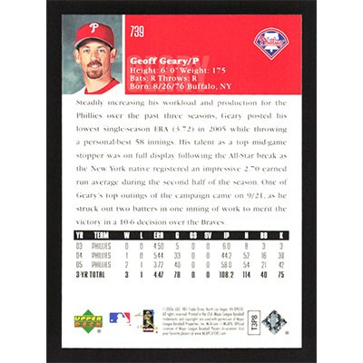 This is a 2006 Upper Deck Geoff Geary baseball card. The card is #739 and pictures show condition.
