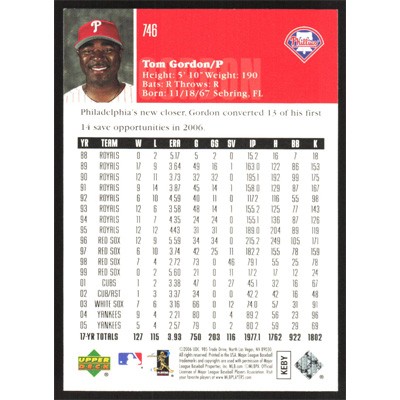 This is a 2006 Upper Deck Tom Gordon baseball card. The card is #746 and pictures show condition.